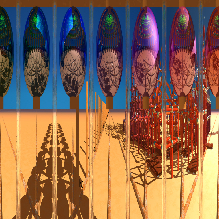 It permits to study and demonstrate the various properties and perspectives. Centered at origin, it is comprised of a cylindrical stack of circles and spheres and of lines on the floor going off to infinity repeated everery 30 degrees, the radius of the circles beeing 1 m. Tangential lines and distance marks complete the picture. And then, behind, we see something very strange...