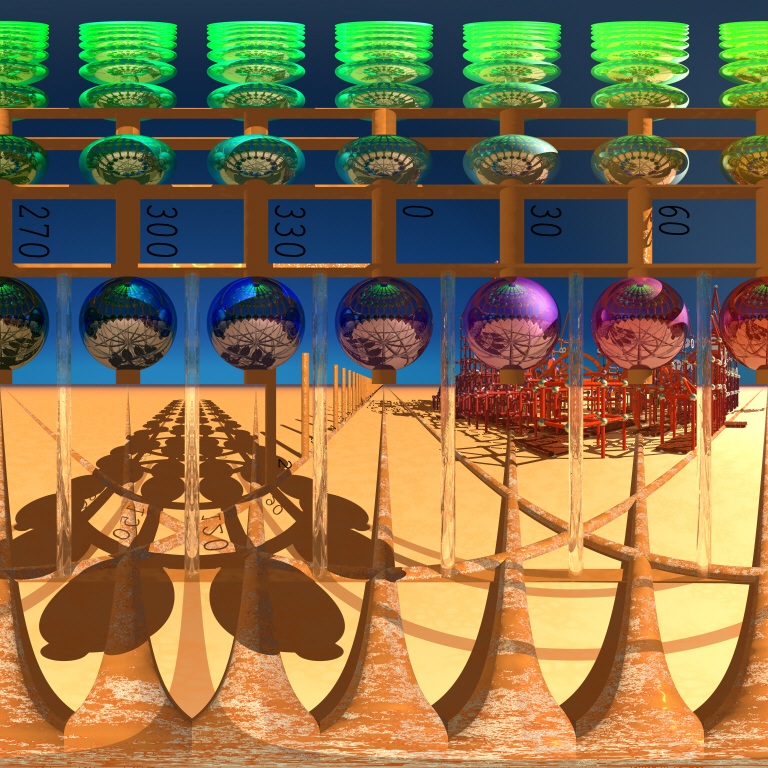 This camera uses sort of a fisheye perspective: you can see the typical curved lines, as we look around in all directions. But it is aimed at filling the whole image area. To achieve this, the image stretches out diagonally to reach the square borders. This means we get distortions at the edges. In this camera test scene, all spheres at a given level have the same distance to the camera (at origin). But here the speres near the image corners show up much larger.