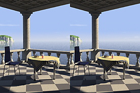 One of the stunning POV-Ray 3.5 sample scenes is «balcony» by Christoph Hormann <chris_hormann@gmx.de> (August 2001). This scene demonstrates the use of various new or changed features of the current POV-Ray version. The stereoscopic base for this image is enlarged a bit with respect to the common human eye separation. Doing so enhances the 3D effect, but at the same time reduces all object's percieved dimensions, as if we where looking at a tiny model.