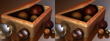Maybe you recall Dan Farmer's Woodbox? It's one of the sample scenes distributed with POV-Ray. Often, an image well suited for common (flat) imaging is rather disapointing in stereo view. This was the case here as well. So I rearanged the camera position and made it much more wideangle. Moreover, this one is rendered with radiosity; lighting with three area lights and enclosed into a sphere lit very bright at one side. At the full res. image you may see small problems encountered by antialiasing the rather detailed textures.